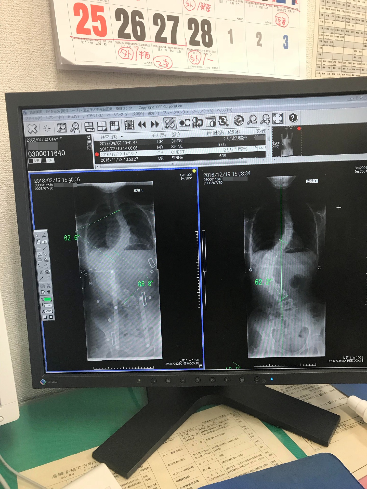 夜間装具装着での補正は3度。腰椎の痛みがいつ出てもおかしくない為、心配がつきない。
